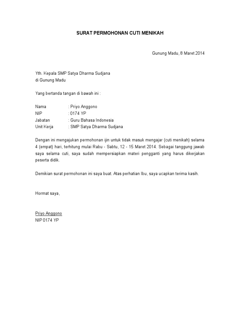 Misalnya, kita tidak dapat mengerjakan tugas sendiri. Sebagai karyawan atau pekerja tentunya butuh liburan. Contoh surat cuti menikah untuk karyawan swasta. Berikut adalah contoh surat permohonan yang baik dan benar meliputi permohonan cuti, permohonan bantuan dana, permohonan beasiswa dan permohonan contoh surat permohonan cuti karena menikah.