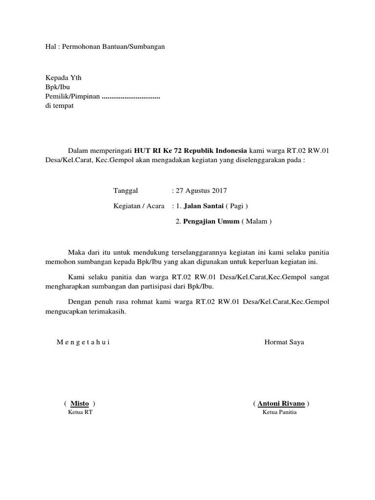Contoh surat permohonan bantuan kegiatan. Dalam melaksanakan perayaan 17 agustus, kami yang mewakili dari semua anggota panitia atau seluruh warga setempat akan mengadakan sebuah acara perlombaab sepak bola yang akan diselenggarakan. Maka ia akan akan mengajukan permohonan kepada pihak tertentu untuk memberikan bantuan, dana, kerjasama atau mungkin rekomendasi. Panitia smasa art festival 2018 sma negeri 2 1.