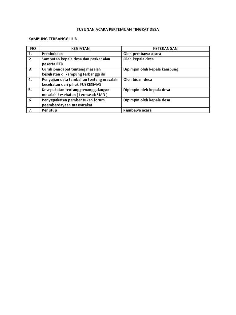Contoh susunan acara rapat laporan pertanggung jawaban. Susunan acara tersebut dibawakan oleh pembawa acara atau mc sebagai panduan untuk memimpin selama jalannya acara. Susunan kepengurusan tim pelaksana inovasi desa (tpid) terdiri atas secara bidang p2ktd bertugas untuk: Download susunan acara musrenbang desa for free.