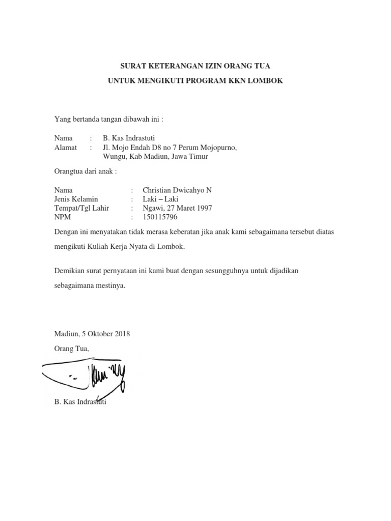Belum/tidak bekerja dengan ini memberikan izin kepada anak saya untuk bekerja di perusahaan yang bapak/ibu pimpin. Berikut ini terdapat contoh surat izin orang tua untuk penempatan kerja yang bisa dijadikan referensi Bandar lampung, 01 juni 2019. Cilongok, rt 05 rw 05 desa cilongok kecamatan cilongok, kabupaten banyumas jawa tengah pekerjaan :