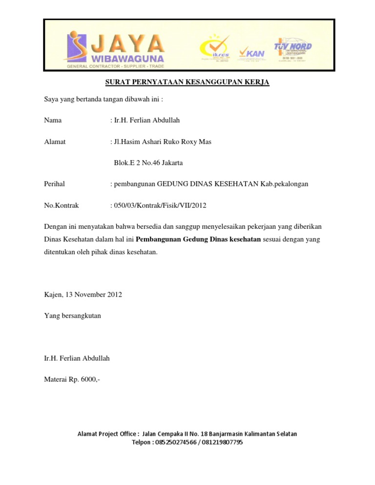 Bagi anda yang akan menandatangani surat ini, terlebih dahulu anda harus. Surat pernyataan kerja bisa diartikan sebagai surat yang. Surat pernyataan kesanggupan merupakan surat yang dibuat oleh seseorang untuk menyatakan bahwa dirinya sanggup untuk melakukan pekerjaan atau aktifitas tertentu yang dibebankan pada dirinya. Untuk lebih jelasnya mengenai format penulisan surat pernyataan kesanggupan, silakan lihat artikel tentang surat pernyataan yang pernah tim lifepal tuliskan.