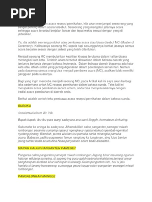 Salam sejahtera bagi kita semua. Bagi yang ingin mencoba menjadi seorang mc, pada artikel kali ini saya akan berbagi teks sederhana untuk mc resepsi pernikahan dalam bahasa sunda. Contoh teks pembawa acara / mc acara tahlilan pengajian dalam bahasa jawa.deskripsi lengkap.