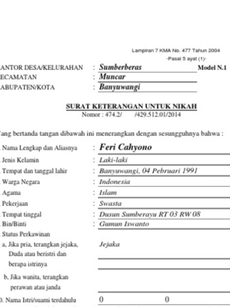 • datang ke kua setempat untuk mendapatkan surat pengantar/rekomendasi nikah (jika calon istri beralamat lain daerah/kecamatan). Untuk formulir model n1 pengantar nikah dari desa dan n2 permohonan kehendak nikah secara umum masih sama kecuali sedikit perubahan kata dan sedangkan form atau blangko yang harus ada tanda tangan dari pihak desa atau kelurahan yaitu : N1, n2, n4 dapat diurus di kantor kelurahan sesuai domisili.