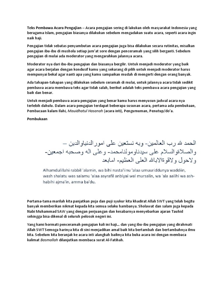 Selain menghafal dengan baik, mengetahui makna atau arti teks juga sangat penting karena dengan mengetahui arti, kita akan menjiwai serta intonasi yang di ucapkan akan bagus dan sesuai. Sebagai pemandu acara tidak lain saya akan membacakan susunan acara pada pengajian malam hari ini: Selain menghafal dengan baik, mengetahui makna atau arti teks juga sangat penting karena dengan mengetahui arti, kita akan menjiwai serta intonasi yang di ucapkan akan bagus dan sesuai. Untuk memandu acara pada kesempatan kali ini.