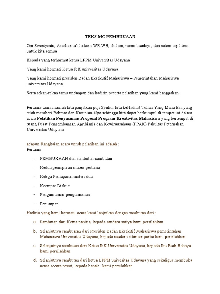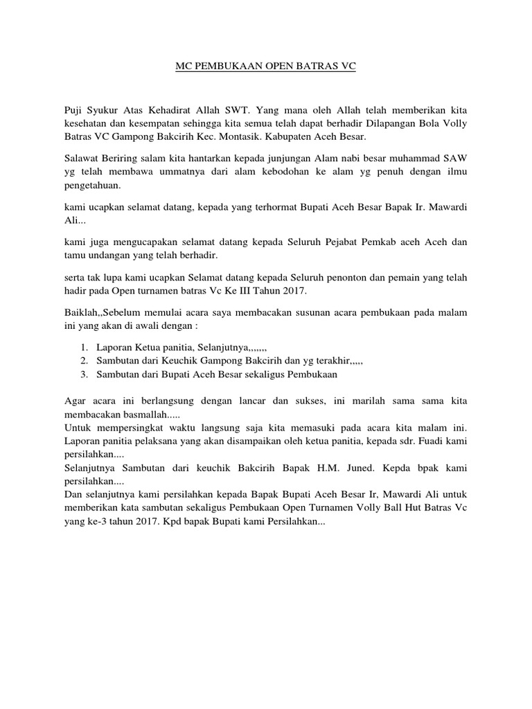 View Contoh Mc Acara Olahraga Pics. Pengertian mc atau master of ceremony merupakan seseorang yang bertugas untuk mengarahkan jalannya acara formal atau non formal, dari awal sampai seorang mc harus mengetahui perbedaan penggunaan tata bahasa saat acara formal dan juga non formal. Dokumen ini berperan sebagai laporan yang menyangkut tentang barang yang rusak saat diterima.