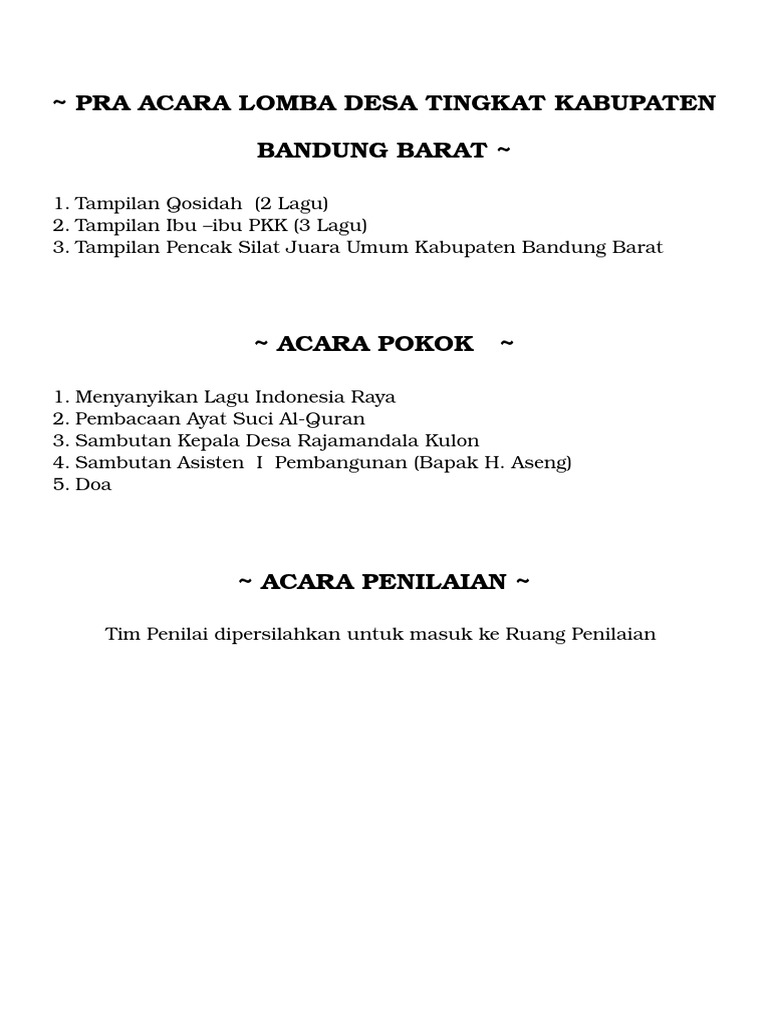 View Contoh Susunan Acara Lomba Desa Pictures. Nah, untuk menghindari hal tersebut kamu membutuhkan susunan acara rapat sebelum rapat tersebut dilaksanakan dimana susunan tersebut menjadi panduan terhadap waktu. Berikut ini beberapa contoh susunan acara pada beberapa jenis acara.