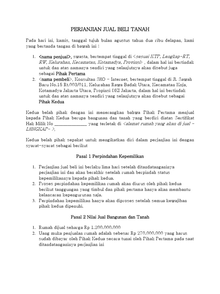 Apabila ternyata pihak pertama tidak mengirimkan uang sesuai dengan pasal 3 perjanjian ini. Tanda tangani dan beri tanggal dokumen dan berikan ruang bagi pihak lain untuk melakukan hal yang sama. Contoh surat pernyataan jual beli tanah dan bangunan. Uang muka atau down payment adalah sejumlah uang yang dianggap sebagai tanda jadi dari pembeli kepada penjual.